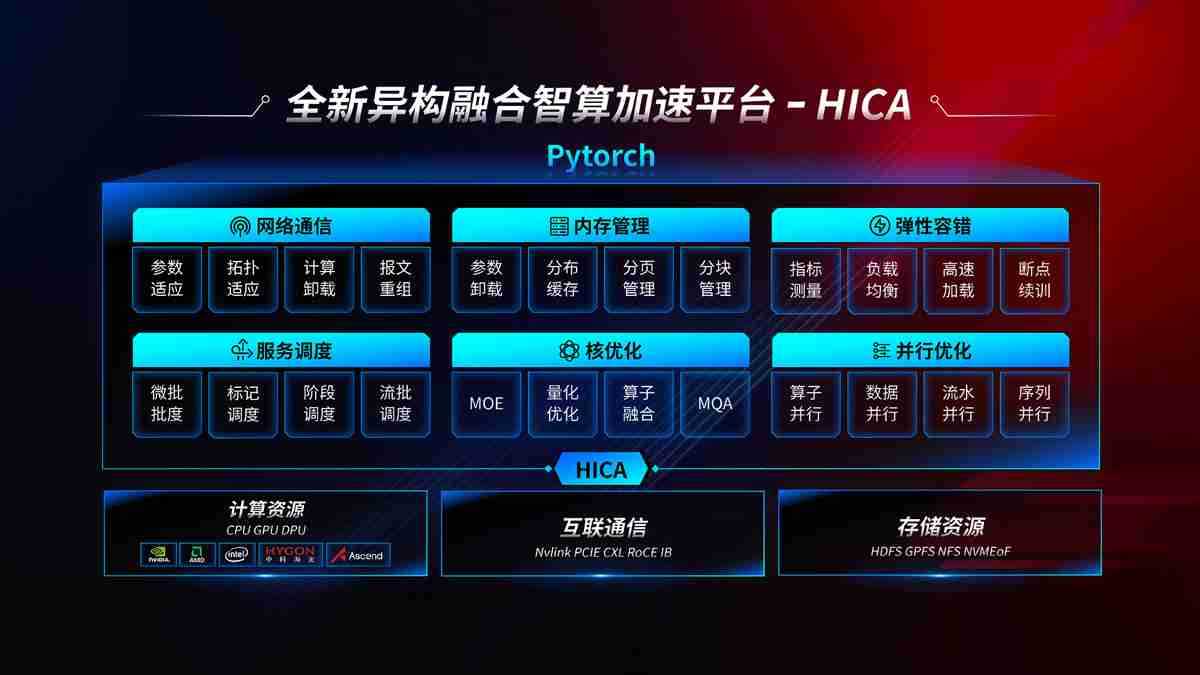 通过自研的服务层、、中间适配层、、、以及调度编排算法,,采用数据并行、、模型并行等多种并行方式,,,,把并行计算任务进行有效的分解,,,使其分别由相应的软件栈和算力资源来承接。。。当GPU资源变化,,,,HICA可以实时动态调度计算子任务并调整模型拓扑和架构,,,以充分聚合各种算力资源。。。。