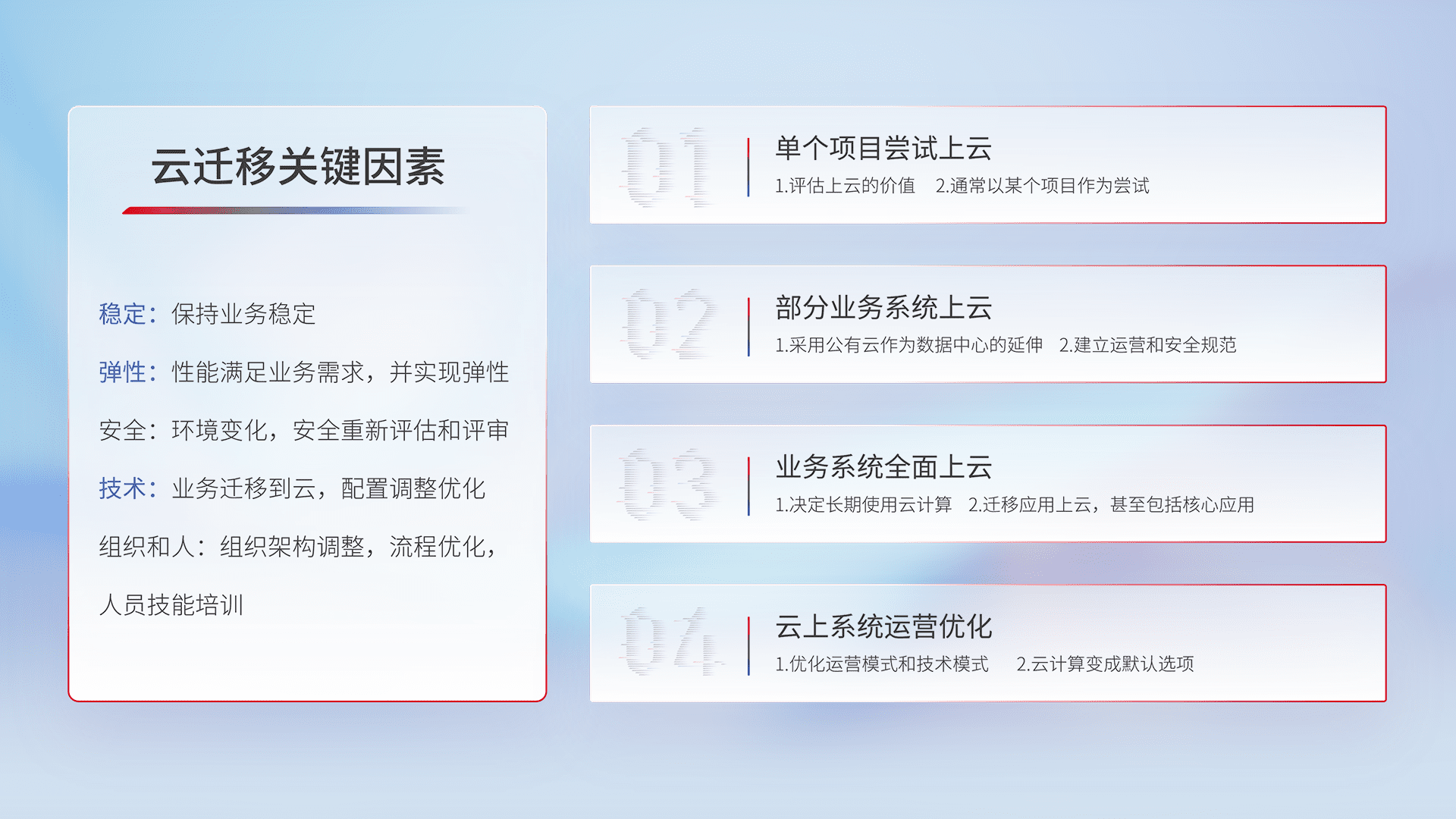 结合实际业务,,从规划设计、、、、云平台选型、、、、云原生改造、、、、数据迁移、、、集成交付,,,,迁移全过程为客户识别最佳上云路径,,,做好风险识别管理,,,,设计网络架构、、、、身份权限、、、安全审计合规、、、操作审计、、日志审计、、、监控告警策略、、多站点容灾设计等,,,,对云上基础设施进行整体规划,,,提升IT治理水平,,以满足弹性、、、高可用、、、、高性能的需求。。。。