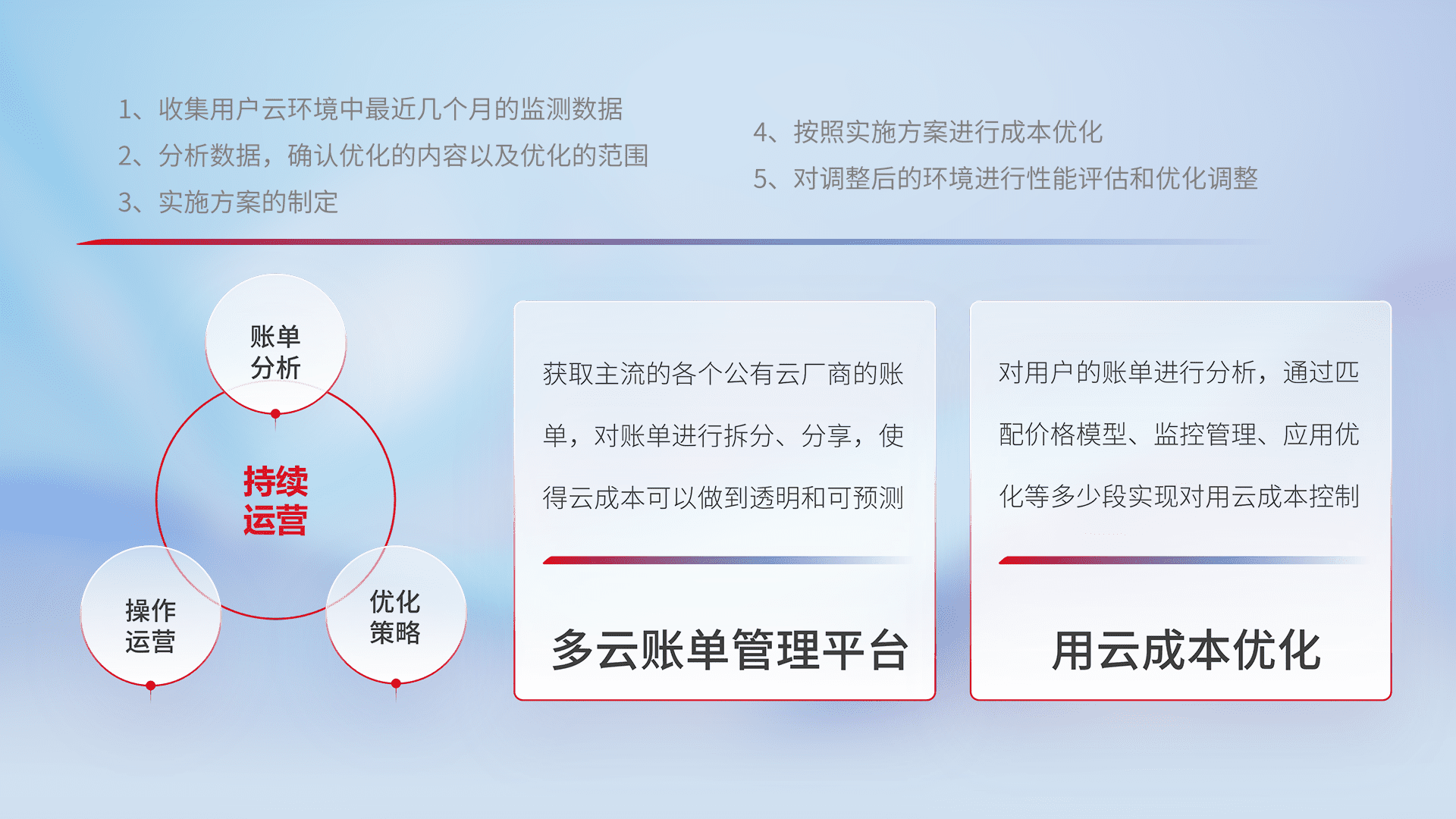 通过多云纳管,,以统一的资源数据模型把客户的云资源进行抽象和封装,,进而实现对多云资源的统一操作,,保障云资源管理的可靠性、、稳定性与可用性。。量身定制化运维内容,,,配置、、、开发运维、、补丁管理、、、、备份、、、、监控、、、、认证和访问管理、、、、审计和日常巡检等,,,保障在用云过程中的可靠度,,,,稳定度以及高可用率。。。